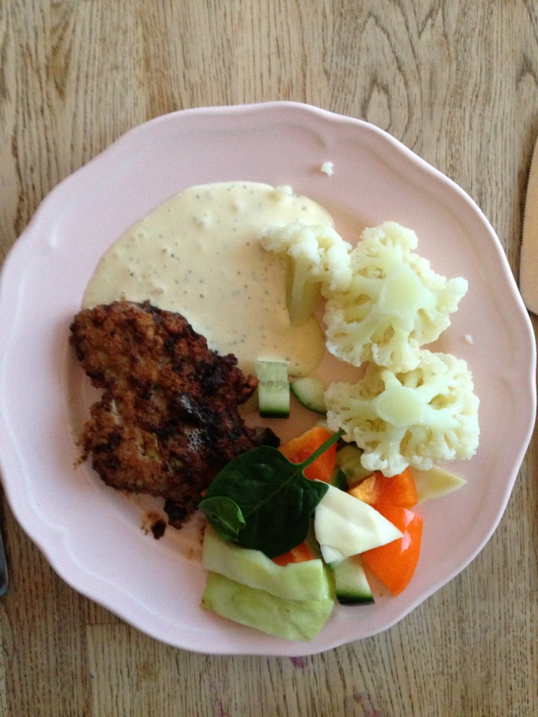 Igår blev middagen kycklingbiffar med kokt blomkål och basilikamajonnäs. Barnen och mannen fick blomkålsmos istället.